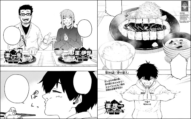 第304話 夢の恩人『久しぶりの我が家、眼の前にはとんかつ!エゴイストにも一時の休息は必要不可欠』 潔世一「いっただっきまぁす!」 潔伊世「世っちゃん、おつかれさま!」 潔一生「食え食え潔世一選手!母さんの祝勝とんかつだ!」 潔世一「美味ぁ♡勝って食うとんかつ美味ぁ♪」 潔伊世「よかったぁ。でもいきなり帰ってきてビックリした。しばらくブルーロックはお休みなの?」 潔世一「うんまぁ次の目標のU-20W杯が少し先だからさ、2週間はフリーの時間だって言われたから帰ってきた」 潔伊世「じゃあゆっくり休んでね。明日もとんかつにする?」 潔一生「それにしてもよくわからんコトになったな。人気も実力も年俸も」 潔伊世「コラコラお父さん」 潔一生「あ、ゴメン。休みに帰ってきてるからこの話はナシか」 潔世一「はは!いいよ別に。海外のクラブチームからのオファーは一旦ブルーロックが預かってくれるってさ。詳しいコトはまた後日で…ひとまずはU-20W杯に集中しろって」 潔伊世「本当に凄いコトよね。お金はともかく優勝したし、ブルーロックの中でも1位になれたんでしょ、世っちゃん」 潔世一「うん、ありがと。1位になりたいって決めて臨んだリーグだったからマジてなれでマジで嬉しい。マジでマジで!」 潔一生「クソおつかれさま」 潔世一「!?え…何!?」 潔伊世「世っちゃんのモノマネ。ずっと練習してたのこの人」 潔一生「マイベストピエロ」 潔世一「おいやめろ!息子をイジるな!悪い父!」 潔伊世「アハハ、でも世っちゃん、これ以上、口悪いのは観てる子どもの教育に悪いからダメよー」 潔一生「クソ完全同意」 潔世一「いやもうそれはカイザーだから!俺じゃねーから!」 🔔「ピンポーン」 「お届けものでーす」 潔伊世「ダンボール?」 潔一生「ブルーロックから」 潔世一「なんだろこれ?大量のディスク!何かの映像かな?と飛行機のチケット…と絵心さんからの手紙?」 ✉『潔世一様。サッカーを知れ。潔世一。お前の次の進化の鍵はこの中にある。自分で見つけ出してみろ。絵心甚八』 潔世一「(これって絵心さんが俺に向けて考えた…俺専用の課題?)」 潔伊世「前から気になってたんだけどさ、世っちゃんから見て絵心さんってどーゆー人なの?」 潔世一「え…いやまぁとにかく尖ってて、自分の哲学を持ってる人かな。あと絶望的に愛想とかないし、誰相手でも本当のコトしか言わないし、その辺にいたらただの変人だね」 潔一生「BLTVで観たまんまの人か」 潔伊世「じゃあ逆に信用できるかも」 潔世一「うん。それに日本サッカーがワールドカップ優秀するってコトをこの地球で誰よりも信じてる人。なんかさ…伝わるんだよ。大人の本気って…本気の“熱”って…絵心甚八は世界一面白くてイカれてる俺の“夢の恩人”だ」 潔伊世「世っちゃん楽しそ!いい人に出逢えたんだね」 潔一生「変わったな世一!ちょっと見ない間に父さんよりしっかりしたんじゃないかぁ?」 潔世一「それはない。父さんが子どもすぎ」 潔一生「でもなぁ世一、これだけは覚えといてほしい。世一がどんだけ変わっても父さんと母さんが家族だってコトは変わらない。これから世一はもっと大きなモノと戦うんだと思う。傷ついたり傷つけたりして勝負の世界で生きてくと思う。けど、父さんと母さんはずっと変わらないで見てるから何が変わってもいつでも帰っておいで」 潔一生「いつもありがとうございます。ごちそうさまー」 潔伊世「あら、もういいの?」 潔世一「うん。映像チェックしてみたいから」 『潔の部屋』 潔世一「(これ結構古いディスクだな。とりあえず再生するか。絵心さんは俺に何を学ばせたいんだろ)」 潔世一「(お、やっぱりサッカーの映像だよな。いつのなんの試合だろこれ…試合途中からの切り抜き?ゴールシーン…シュートを学べってコトか…あ、またすぐ違う試合の映像…なんだコレ?シュートが止められた?ゴールシーンを学べってコトじゃないのか!?じゃあ何を観せられて…あ?映像が切り変わる度にリズムを変えるトラップやキラーパスから始まってる…そうか!もしかして俺に観せたいのはゴールじゃなくて“試合を変える起点”の瞬間か!?絶対そうだ。これはフィールドに刺激を与えるトラップ・パス・ドリブルのアイデアを絵心さんが過去の世界の映像データから厳選した“ゴールの匂いを生む”プレー集!まだ俺の知らないサッカーが世界中に溢れてる。面白いッ!楽しいッ!新しい刺激をインプットしろ。絵心甚八の思考次元へ辿り着きたい。ブルーロックはまだ進化の途中だ!)」 『U-20W杯まであと45日』 『十人十色の成長過程!世界への挑戦はここから始まる。次号、“×23”につづく』 | |||