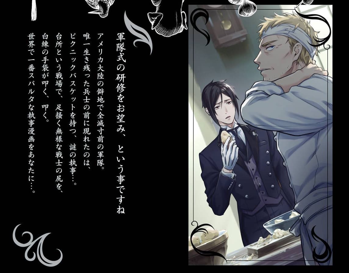 第176話 その執事、厨房セバスチャン「皆さん、おはようございます。彼はバルドロイ。この度、当家の奉公に入る事になりました」 フィニアン「はじめましてバルドロイさん!ガードナーのフィニアンです!フィニってよんでくださいっ」 メイリン「オレ…ワッ…ワタシはハウスメイドのメイリンですだ。よっ…よろしくおねがいしますだよ」 セバスチャン「他にも家令(ハウススチュワード)のタナカさんが在籍していますが、現在は諸事情で休職中です。タナカさんがお戻りになるまでは執事である私…セバスチャン・ミカエリスがこのお屋敷の業務を取り仕切っています。貴方には当家で空席となっているシェフの役職に就いていただく予定です」 バルドロイ「…オイ、そりゃなんの冗談だ?」 セバスチャン「え?」 バルドロイ「アンタ、腕の立つ私兵を集めていると言ったよな。なのに鼻たれた小僧にオドオド女に青白い優男…これじゃ兵隊ごっこで棒きれ振り回すガキにも白旗揚げちまいそうだ」 セバスチャン「ガキに白旗…ですか。まあ子供が非常に手強い生き物なのは確かですね。おや、噂をすれば…ご主人様がお呼びです」 セバスチャン「バルドロイさん、詳しい説明はまた後ほど。フィニとメイリンは頼んだ仕事を始めて下さい」 フィニアン「はーい」 メイリン「ですだ!」 『数日後』 シエル「アメリカ人の軍人をシェフに?」 セバスチャン「はい」 シエル「必要か?厨房はお前一人でもまかなえていただろう」 セバスチャン「しかし社交界においてシェフの雇用は大切なステータスのひとつ。お家再興の為には必ず必要な役職かと」 シエル「そもそも箔がつくシェフといえばフランス人かイタリア人だろう」 バルドロイ「アメリカ人(ヤンキー)じゃあご不満かい?上等な人種が作れば味も上等になるって?食えりゃ味なんかどうだっていいだろ」 シエル「…僕は料理に関して誰が作るかはこだわらない。が、味は上等なほうがいい。戦場では炭になるまで火を通せ…と言われてきたかもしれない。うちのキッチンではやるな。これは命令だ」 セバスチャン「元よりシェフとしての技量を見込んでスカウトした訳ではありません。ただ、ファントムハイヴ伯爵家のマナーハウスには私以外にも上級使用人が必要です」 シエル「やりかたはお前に任せる。しっかり教育しろ」 セバスチャン「かしこまりました」 バルドロイ「(…これがオレの新しい雇用主?10歳になるかならねえかのクソガキが?同じ子供でもアイツとは似ても似つかねぇ。何考えてんだオレは…)」 セバスチャン「バルドロイさん、お待たせ致しました。怪我の経過も良さそうですし、本日はシェフの業務内容について」 バルドロイ「気持ちわりぃな」 セバスチャン「え?」 バルドロイ「アンタ、オレの上官なんだろ?“さん(ミスター)”なんか付けるなよ」 セバスチャン「ではどうお呼びすれば?」 バルドロイ「バルドでいい。部隊じゃそう呼ばれていた」 セバスチャン「…軍隊ではそれで良かったのかもしれませんが、お屋敷の使用人同士は通常略称では呼び合いません。さらに上級使用人ならば本来ファーストネームで呼び合う事もありません。それがお屋敷のお作法です。ですから私はこれからバルドロイさん…とお呼び致します」 バルドロイ「ああそうかい」 セバスチャン「さてバルドロイさん、心得のない貴方にいきなりフルコースを作れと言いません。まずはキッチン・メイド同様に野菜の下拵えや肉のローストから始めていただきます。ちょうど鶏がありますのでロースト・チキンを作ってみましょう。まず丁寧に羽を毟り…」 セバスチャン「これは一体…」 バルドロイ「ロースト・チキン(焼いた鶏)だろ?」 セバスチャン「食べられるようきちんと下拵えを…と言ったはずですが?」 バルドロイ「食えるだろ。戦場でちまちまきれいに羽なんて毟ってられるかよ。食料もなく野生の鳥にまで手を出す状況ならなおさらだ。捕まえたら敵に気づかれねぇように急いで火を通す。あとは適当に切り分けて各自でお好きに。これが戦場のお作法だ。お行儀がよろしい執事様には刺激が強かったか?」 セバスチャン「………………………わかりました。軍隊式の研修をお望みという事ですね」 バルドロイ「は……?」 セバスチャン「戦場では上官に逆らえば当然こうなりますよね?…おや、新米コックにはスパイスが強かったですか?」 バルドロイ「こっ…のやろう!」 | |||